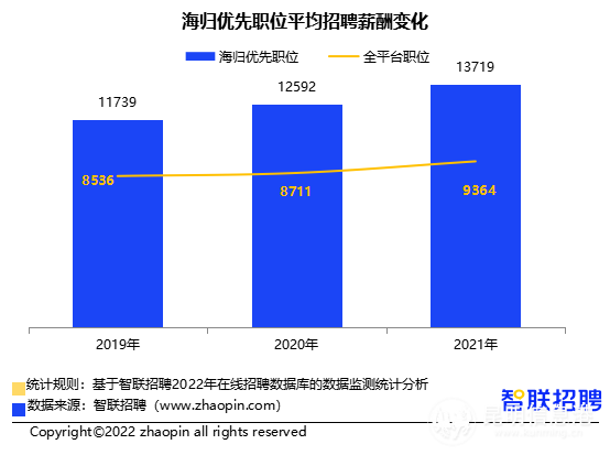 从海归优先职位平均招聘薪酬与全平台职位平均月薪对比来看,海归优先职位的平均招聘薪酬连续三年走高,2021年达13719元/月,高出全平台职位平均月薪(9364元)46.5%。从增速来看,2020年及2021年海归优先职位平均薪酬同比涨幅分别为7.3%和8.9%,均高于全平台职位(2.1%和7.5%)。