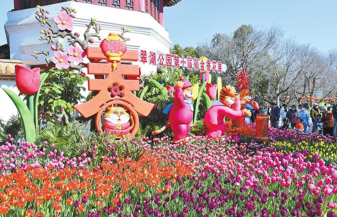 近日,翠湖公园各色郁金香绚烂绽放,市民赏花游春,陶醉在大美春光中。如期而至的翠湖公园第十届郁金香花展,共展出王朝、红色力量、小黑人、巨粉、纯金、王室女孩、巨粉等品种的郁金香8万余株,同时辅以中国水仙、月季等花卉点缀,营造出百花盛开迎新春的缤纷景象。(云南日报 记者杨峥)