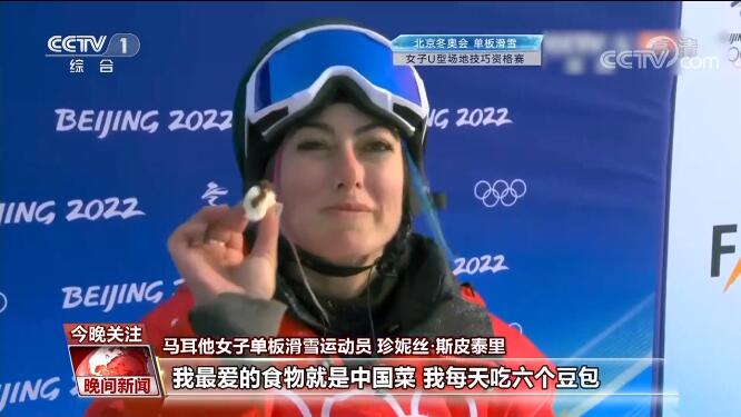 马耳他女子单板滑雪运动员 珍妮丝·斯皮泰里:我最爱的食物就是中国菜,我每天吃六个豆包。今天早上我太紧张了都吃不下东西,就把豆包放到了背包里,我的口袋里也有一个豆包,在我做完第一轮动作之后,我想我终于可以吃上一口了。