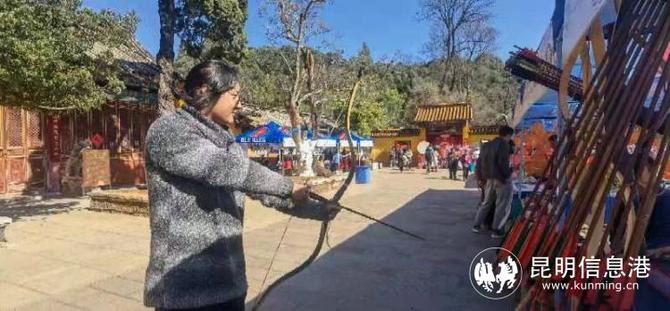 此外,现场展出的弓箭也吸引了民众纷纷前来拉弓体验。各非遗展位前都吸引了民众驻足欣赏和了解。今年非遗展期间还引入了传统饮食及医药展,建新园米线、昆明焖炉烤鸭、呈贡豌豆粉、七甸酱菜、寻甸牛干巴让游客们来了一次舌尖之旅,现场还可以向圣爱中医、昆中药、百草膏进行相关医药咨询。据了解,2月12日、13日,黑龙潭还将每天各举办一场民族民间歌舞乐、传统戏剧节目展演,主要展演传统滇剧折子戏和花灯歌舞。