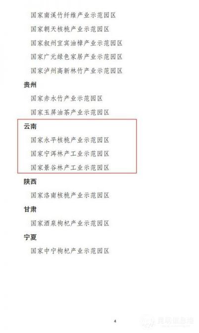 昆明信息港讯 记者黄彩英 近日,国家林业和草原局印发通知,公布了第二批国家林业产业示范园区名单,云南省推荐的国家永平核桃产业示范园区、国家宁洱林产工业示范园区、国家景谷林产工业示范园区入选。