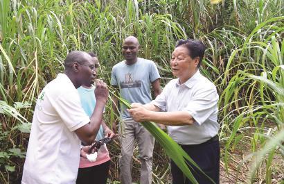 ▲林占熺(右一)在福建农林大学菌草园让尼日利亚留学生试尝幼嫩菌草的味道。| 新华社发