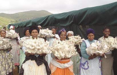 ▲南非一家菌草合作社的群众展示收获的菌草平菇。| 新华社发