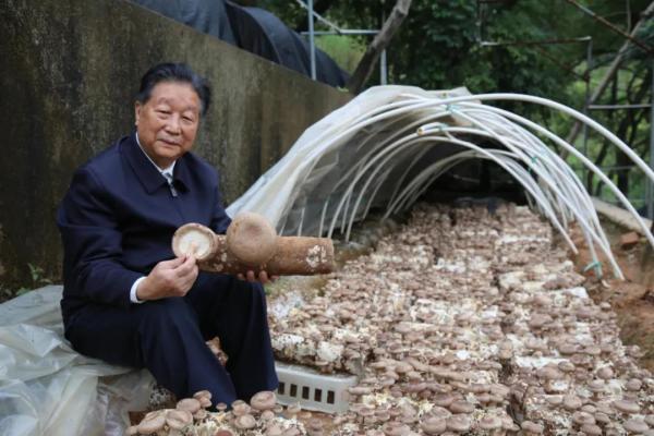 林占熺查看菌草香菇生长情况