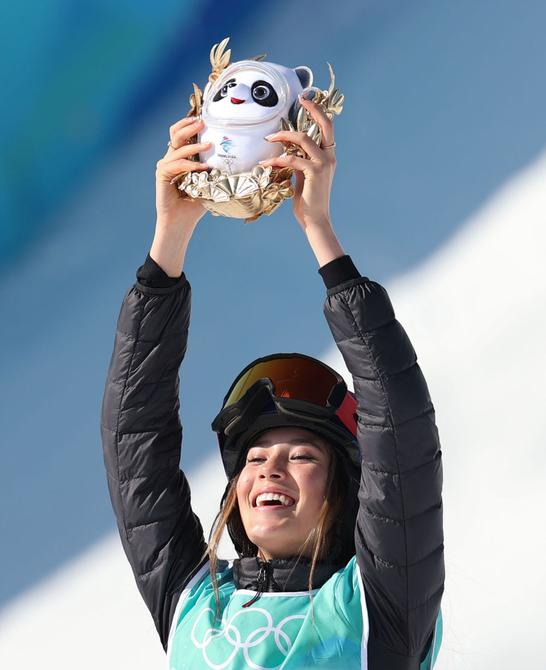 ↑2月9日,单板滑雪女子障碍追逐赛冠军、美国选手琳赛·雅各贝利斯在颁发纪念品仪式上高举金色冰墩墩。
