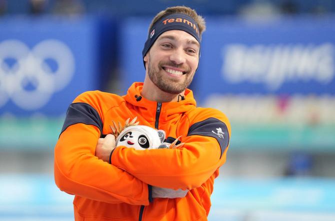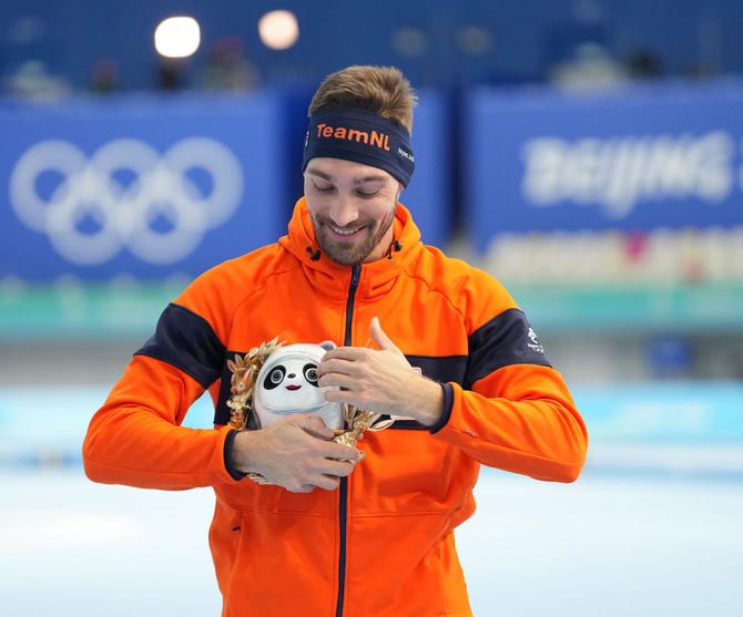 ↑2月8日,速度滑冰男子1500米冠军、荷兰选手凯尔·内斯在颁发纪念品仪式上抱紧金色冰墩墩。
