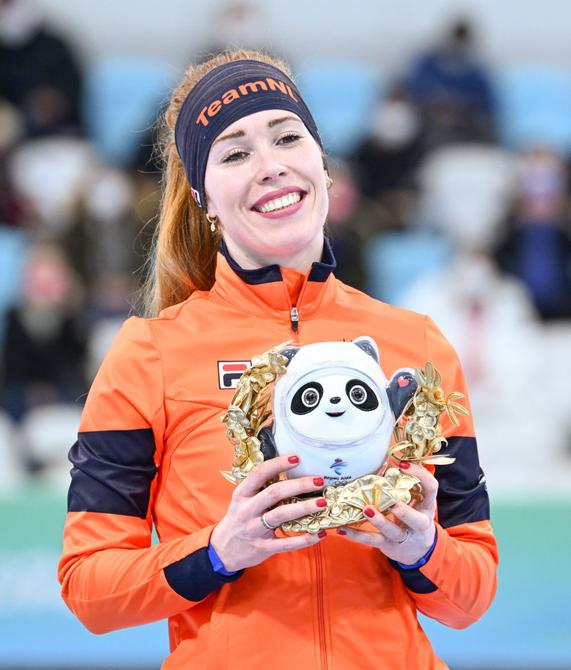 ↑2月7日,速度滑冰女子1500米季军、荷兰选手安托瓦尼特·德容赫在颁发纪念品仪式上手捧金色冰墩墩。