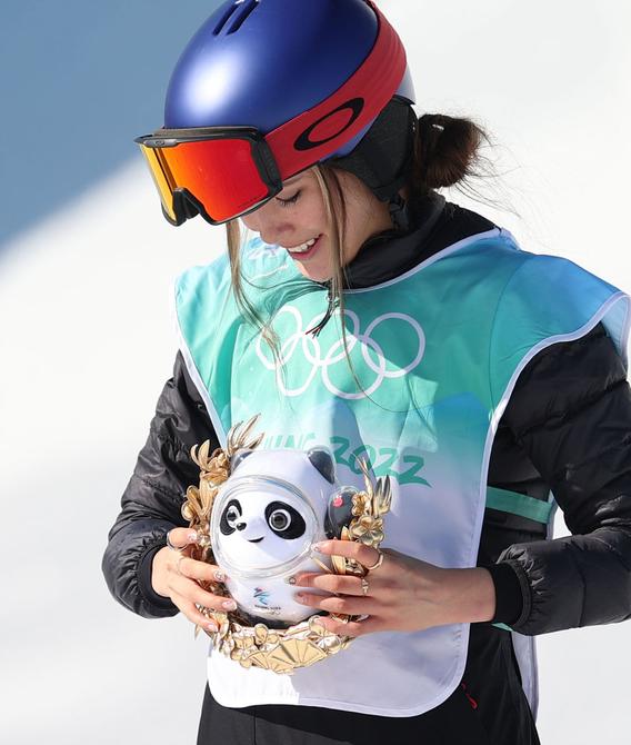 ↑2月8日,自由式滑雪女子大跳台冠军、中国选手谷爱凌在颁纪念品仪式上看着手中的金色冰墩墩。