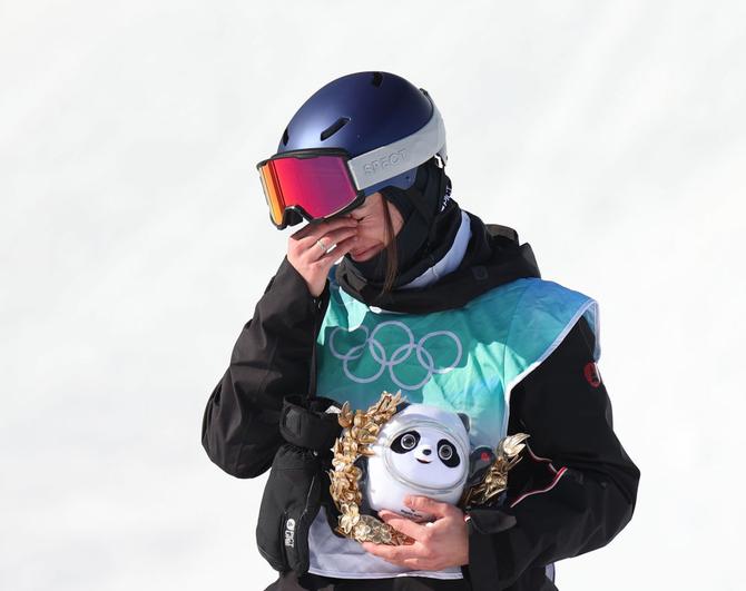 ↑2月9日,单板滑雪女子障碍追逐赛冠军、美国选手琳赛·雅各贝利斯在颁纪念品仪式后带着金色冰墩墩离场。