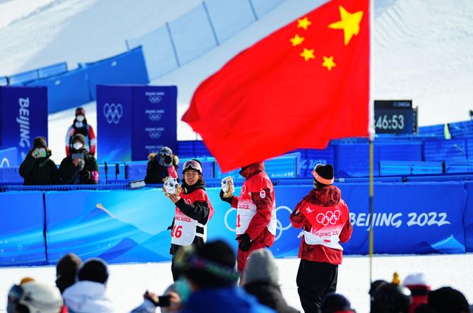 ↑2月8日,自由式滑雪女子大跳台冠军、中国选手谷爱凌在颁发纪念品仪式上高举金色冰墩墩。
