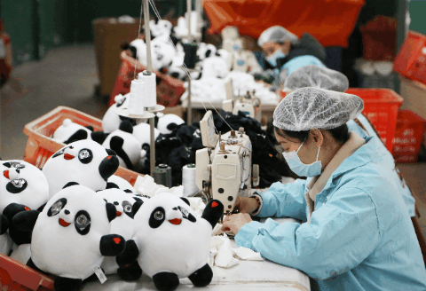 ↑2月7日, 花样滑冰团体赛冠军、俄罗斯奥委会队选手在颁发礼品仪式上拍照时将金色冰墩墩摆成一排。