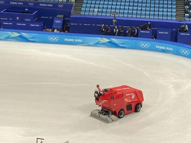 比赛间隙,浇冰车正在平整冰面。(总台央广记者李行健 摄)