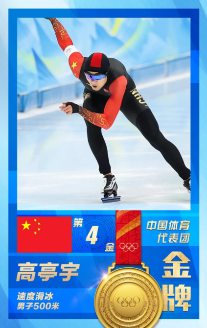 12日下午的“冰丝带”再度见证了历史!中国代表团开幕式旗手高亭宇亮相速度滑冰男子500米赛场,以34秒32的骄人成绩,打破了由挪威选手在2018年平昌冬奥会上创造的34秒41的奥运会纪录,为中国代表团拿下第四金。