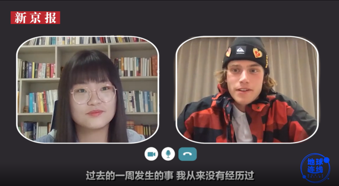 2月10日,新京报记者连线西班牙自由式滑雪运动员蒂博·马格宁,马格宁谈视频走红后的感想。《地球连线》视频截图