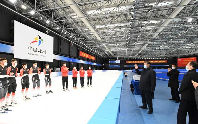 △ 2022年1月4日,习近平总书记在北京考察2022年冬奥会、冬残奥会筹办备赛工作。这是4日下午,总书记在二七厂冰雪项目训练基地速滑馆,向参训运动员、教练员表示慰问。