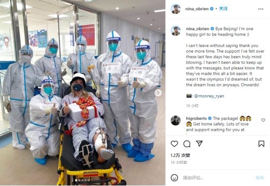 美国选手尼娜·奥布莱恩在海外社交媒体发文感谢中国医护。(图片来源:Instagram)