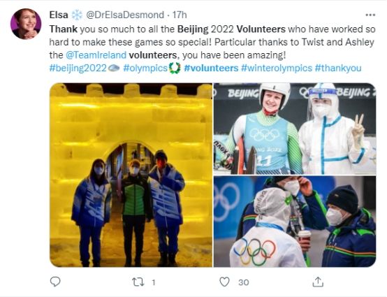 爱尔兰雪橇运动员埃尔莎·德斯蒙德在自己的社交账号发文感谢志愿者们的热情帮助。(图片来源:推特)