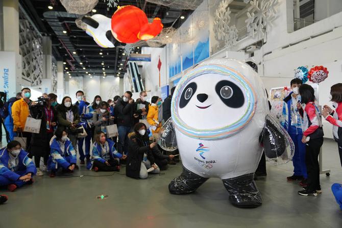 2月12日,“冰墩墩”在北京冬奥会主媒体中心举办的集体采访活动中与现场观众互动。新华社记者鞠焕宗摄