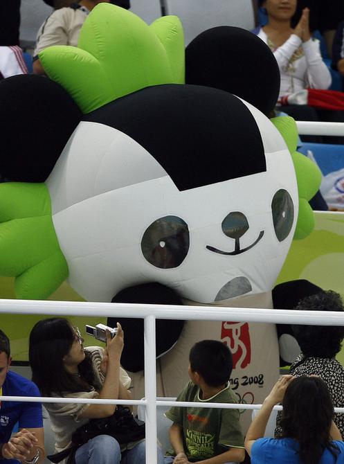2008年8月14日,福娃“晶晶”来到国家游泳中心观众席为北京奥运会游泳比赛的选手加油助威。新华社记者丁旭摄