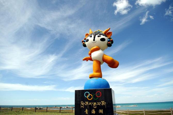2008年6月22日,青海湖畔的“福娃迎迎”的塑像。新华社记者任晓刚摄