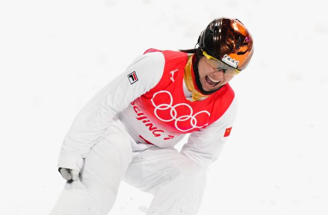 2月10日,中国队选手徐梦桃在北京冬奥会自由式滑雪空中技巧混合团体决赛中庆祝。新华社记者薛玉斌摄