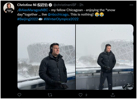 13日,美国全国广播公司(NBC)华裔记者倪君怡发布了他们在鸟巢附近现场报道的情况,并配文称自己的同事很享受这个“大雪天气”。↓