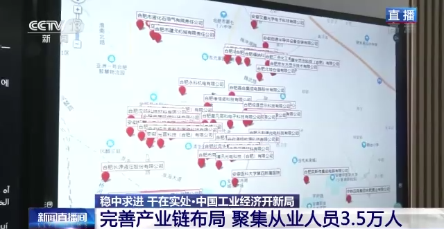 目前在合肥,整个新型显示产业,以京东方这样的龙头企业为依托,已经形成了非常完善的产业链,我们再通过一张图来看一下。以我所在的这里为中心,方圆5公里内,显示产业的企业数量超过了40家。截至目前,合肥显示产业企业数量超过123家,2021年实现产值792亿元,同比增长29.7%,近三年年均增长27.45%。集聚从业人员3.5万人。