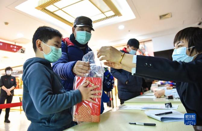 2月14日,工作人员将“冰墩墩”毛绒玩具交到小朋友手中。新华社记者 陈钟昊 摄