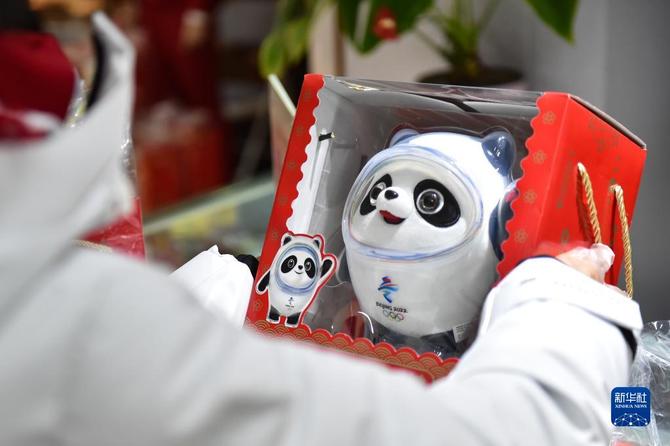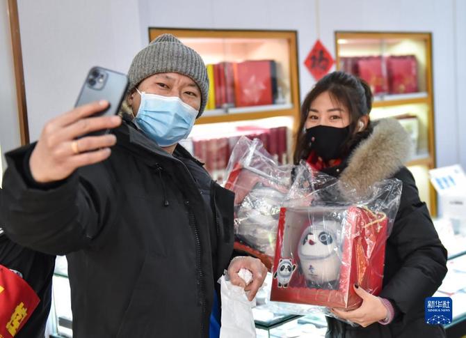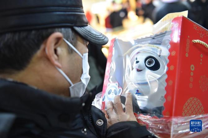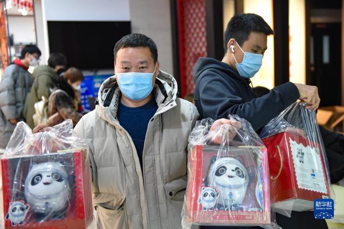 2月14日,顾客于海峰向记者展示取到的“冰墩墩"毛绒玩具。新华社记者 陈钟昊 摄