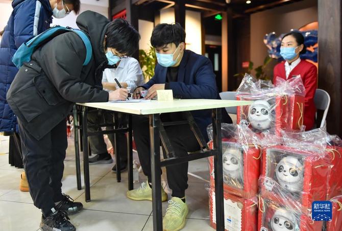 2月14日,顾客在领取预订的“冰墩墩”毛绒玩具前登记个人信息。新华社记者 陈钟昊 摄