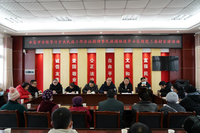 为深入学习宣传贯彻关于加强和改进民族工作的重要思想及中央民族工作会议精神,进一步铸牢中华民族共同体意识。2月8日,水富市委常委、统战部部长、政法委书记郭伦强,市政府副市长吴涛,率领市委统战部市民宗局、市委政法委、市司法局、水富华泰律师事务所等相关领导和人员到水富市两碗镇三角村宣讲中央民族工作会议精神。三角村“两委”全体成员、村民小组长、村民代表、外出务工返乡群众代表等50余名各族群众聆听宣讲。