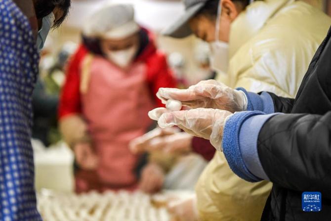 当给抗疫工作者送汤圆的提议在莲城社区的微信群中发出后,社区居民踊跃报名。650多公斤糯米等材料很快筹集到位。在将糯米浸泡、磨粉、脱水等一系列准备工序后,来自莲城社区的50多名居民在遵守疫情防控规定的前提下,开始制作手工汤圆。