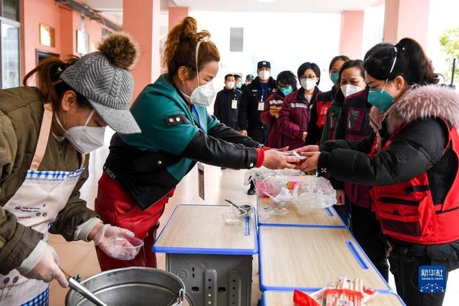 2月15日,广西德保县城关镇莲城社区工作人员黄佩妮(左二)和志愿者一起为抗疫一线的工作人员送汤圆。新华社记者 曹祎铭摄
