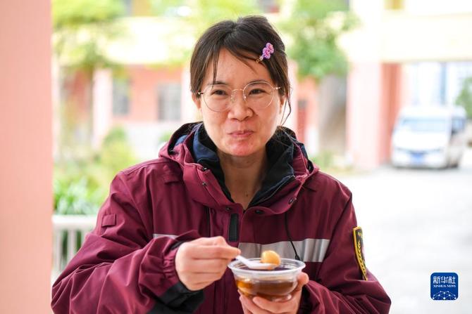 2月15日,流调队员姚雪婷在吃广西德保县城关镇莲城社区居民制作的手工汤圆。新华社记者 曹祎铭 摄