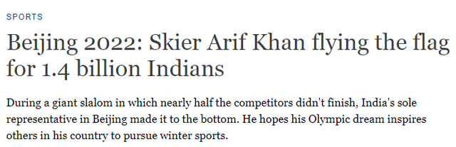 德国之声报道称,在13日的比赛中,积雪松软,能见度极低,不过31岁的穆赫德·汗还是坚持到最后一刻。他知道,千千万万的印度同胞在观看这场比赛,必须奋战到底。