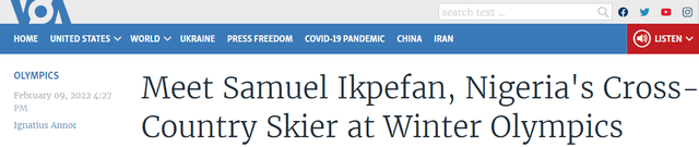 美国之音报道称,尼日利亚越野滑雪运动员塞缪尔·伊克佩凡是该国历史上首位参加冬奥会的滑雪运动员。