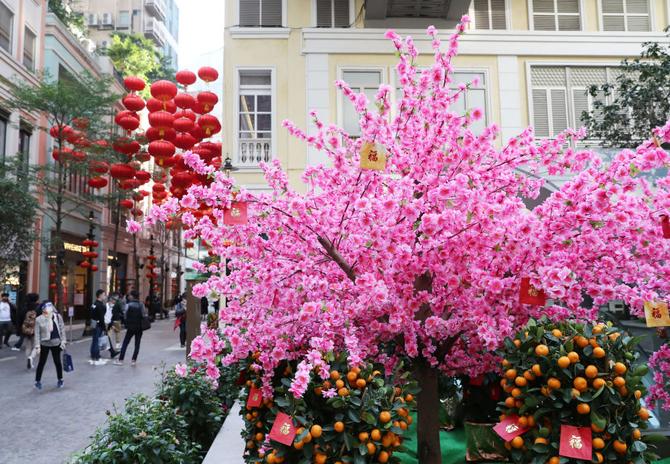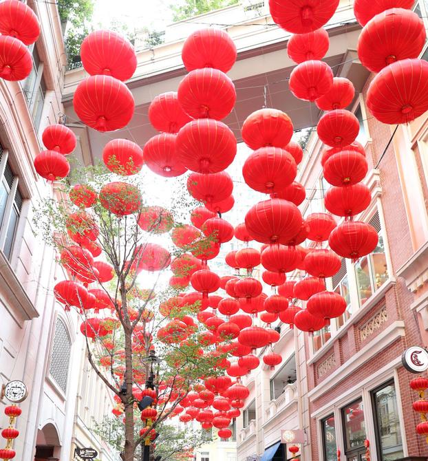 2月15日在香港利东街拍摄的节庆装饰。当日是元宵节,香港街头的节庆装饰烘托出节日氛围。新华社记者 李钢 摄