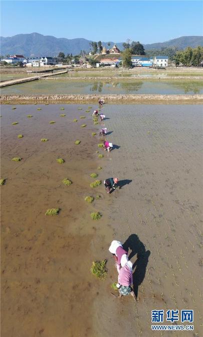 云南省勐海县勐遮镇曼扫村村民在栽插水稻(2月13日摄)。