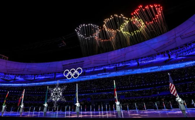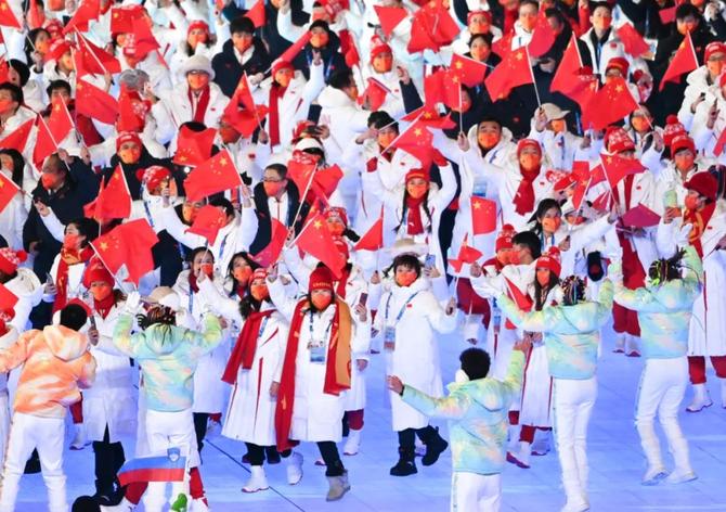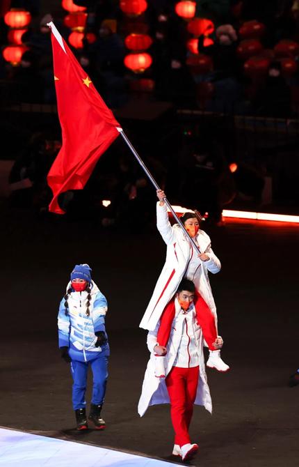 这是中国代表团旗手徐梦桃与高亭宇在闭幕式上入场。新华社记者程婷婷 摄
