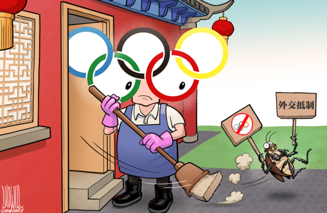 ▲ 北京冬奥会用出色的赛事组织将部分国家所谓“外交抵制”的不和谐声音“扫地出门”。 (漫画 | 罗杰)