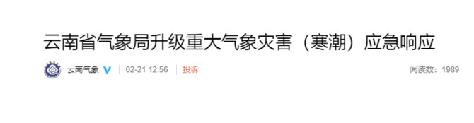 2月21日,记者从云南气象微博获悉,09时30分云南省气象台升级重大气象灾害(寒潮)应急响应,将寒潮蓝色预警升级为寒潮黄色预警:过去24小时,昭通、曲靖、昆明、玉溪东部、红河、文山、迪庆出现低温雨雪天气。预计未来24小时,滇中、滇东北及滇东南日平均气温将下降到4℃以下,且最低气温小于等于1℃,其中昭通、曲靖、昆明东部最低温度小于-2℃。