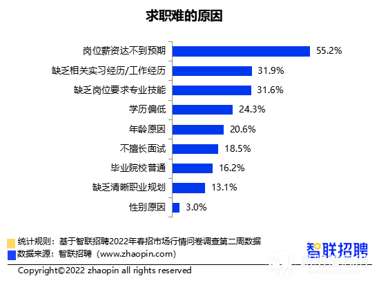 春节后第二周投递简历量环比增加7.5%,竞争指数由上周的11.3上升至15.4,一个空缺岗位平均收到15份投递简历,求职热度升温。66.6%的受访求职者认为今年春季求职比去年更难,这一比例较上周提高6个百分点。被问到求职的困难点时,55.2%的人表示岗位薪资达不到预期,31.9%的人表示缺乏相关实习或工作经历,31.6%的人表示缺乏岗位要求的专业技能。此外,学历、年龄、面试经验、毕业院校等因素也是求职难的原因。
