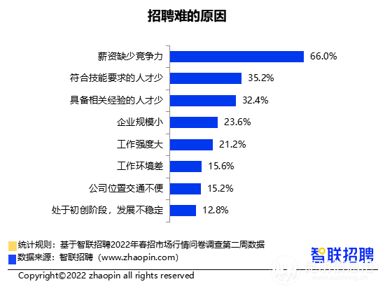 企业招人也难。48.6%的受访企业表示今年春招难度与去年相同,仅11%的认为今年招聘更容易。关于招聘难的原因,66%的受访企业认为薪资缺少竞争力,35.2%的表示符合技能要求的人才少,32.4%的认为具备相关经验的人才不足。此外,企业规模、工作强度、工作环境、地理位置等,也是企业招人难的原因。