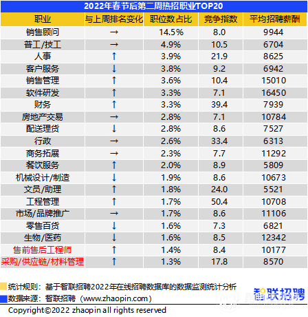 职业方面,售前售后工程师、采购/供应链/材料管理跻身招聘需求TOP20职业。在企业逐渐复工复产背景下,原材料等需求量增大,采购和材料管理相关岗位的人才需求量也水涨船高。同时,该岗位的进入门槛相对低,求职申请火爆,竞争指数由上周的13.1上升至17.8,竞争较为紧张。