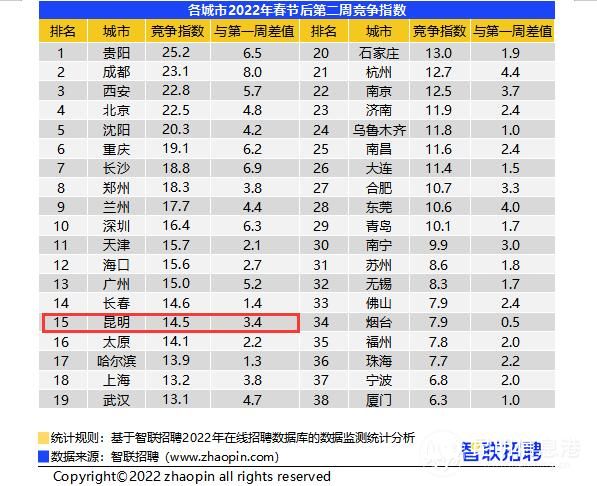 在全国38个核心城市中,本周贵阳的竞争指数最高,达到25.2,较上一周增长6.5,成都和西安的求职竞争也比较激烈,分列第二位和第三位。昆明以14.5的竞争指数排名第15位,较上周增长3.4。