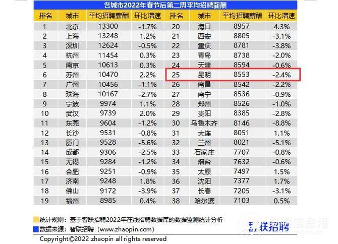 智联招聘近日发布《2022年春招市场行情周报(第二期)》,其中指出,春节后第二周求职热度升级,竞争指数达15.4,招聘难与求职难并存。本周招聘平均薪酬小幅升至10118元/月,但昆明的招聘薪酬不升反降,由上周的8768元跌至8553元,在全国38个核心城市中的排名也下跌一位至第25位。
