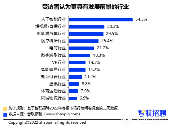 除体育产业外,近年来新兴的VR、短视频等行业也备受关注。职场人最看好人工智能行业,54.3%的受访者认为该行业更具有发展前景。新冠疫情加速了人工智能在诸多领域和场景的应用,在产业政策支持下,行业市场潜力巨大,存在较大人才缺口,薪资水平也颇具竞争力,高薪且低竞争,因此在招聘市场上热度高。此外,短视频/直播、新能源汽车、医疗科研等行业也被认为具有发展前景。(昆明信息港 记者江枫)