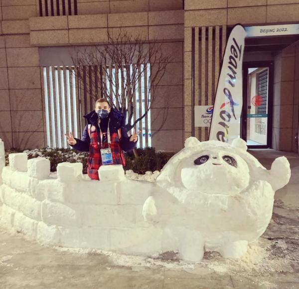 照片中,皮维罗托双手比“耶”,和“冰墩墩”雪人开心合照。