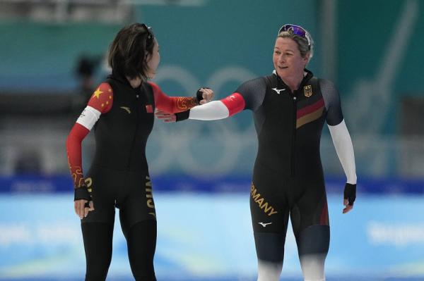 △比赛结束后,中国选手阿合娜尔向德国老将佩希施泰因表达敬意,佩希施泰因微笑着鼓励阿合娜尔。