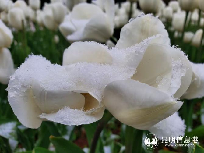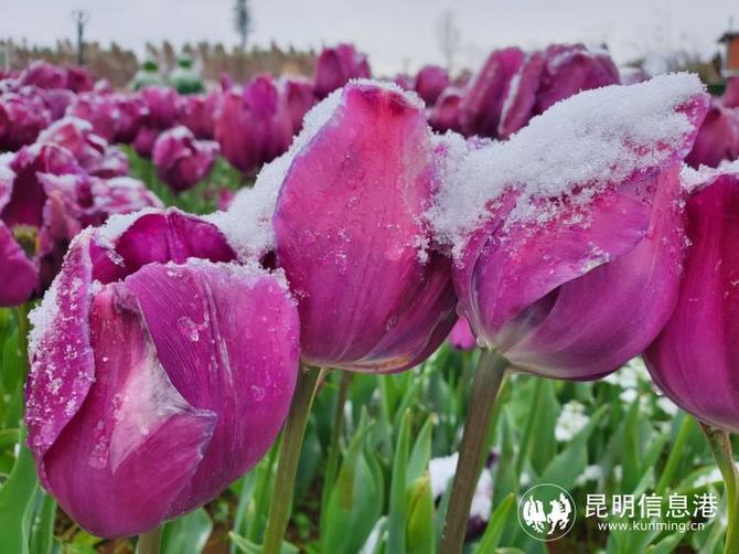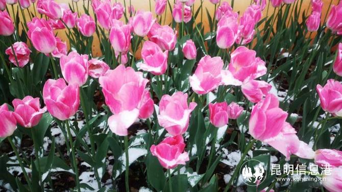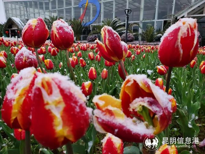 位于昆明滇池国家旅游度假区的捞渔河湿地公园内,郁金香在雪中绽放。